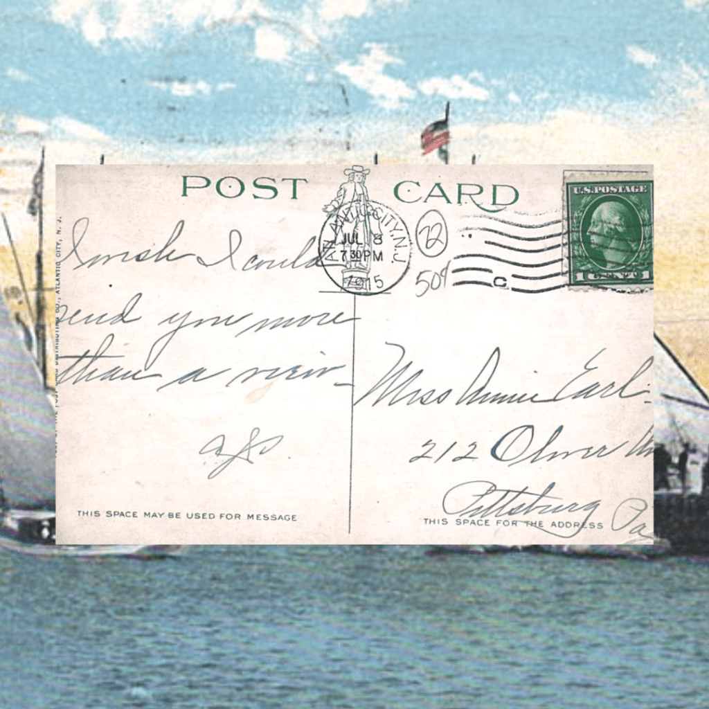 This is one of the few cards I have that’s from a true resort town, and I love the vibes of it all. By 1915, Atlantic City was already a destination city, bringing in over 500,000 people by rail every year. At this time, the boardwalk was over 7 miles long, and an array of large hotels sprawled along the ocean, some capable of holding up to 2,000 guests. I have to assume that the sender of this card was in Atlantic City on vacation, though, of course, they could have been a seasonal worker.
