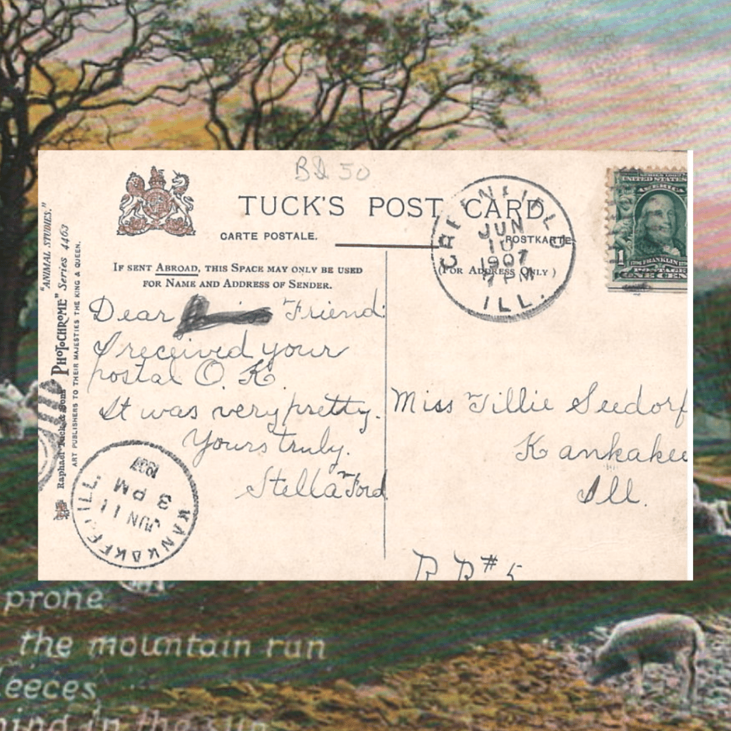 However, I think one of my favorite things about this particular card, however, is how *human* it feels. The square in “square head” is drawn in such a way that the reader can see the direction her hand took. The reader can also see the mistake in “still”; the “s” covering up whatever was written before. Square Head was probably in a rush, or perhaps her mind was ahead of her hand and she began a sentence she wasn’t quite ready for. Undeterred, she clumsily corrected the mistake and continued on in her quick note to her friend. You see it again in the “c” of knock. It’s something so little, but brings the postcard — and the woman — to life in such a tangible way. I love it.