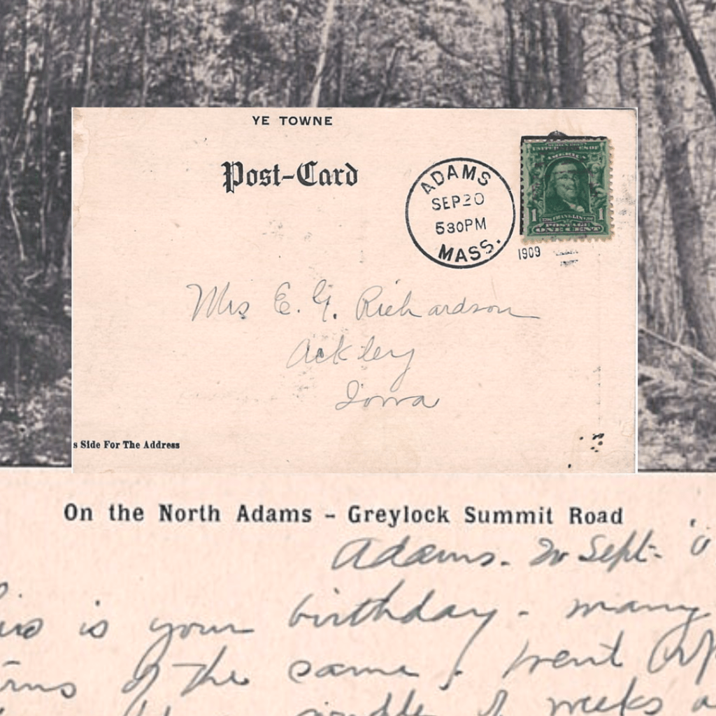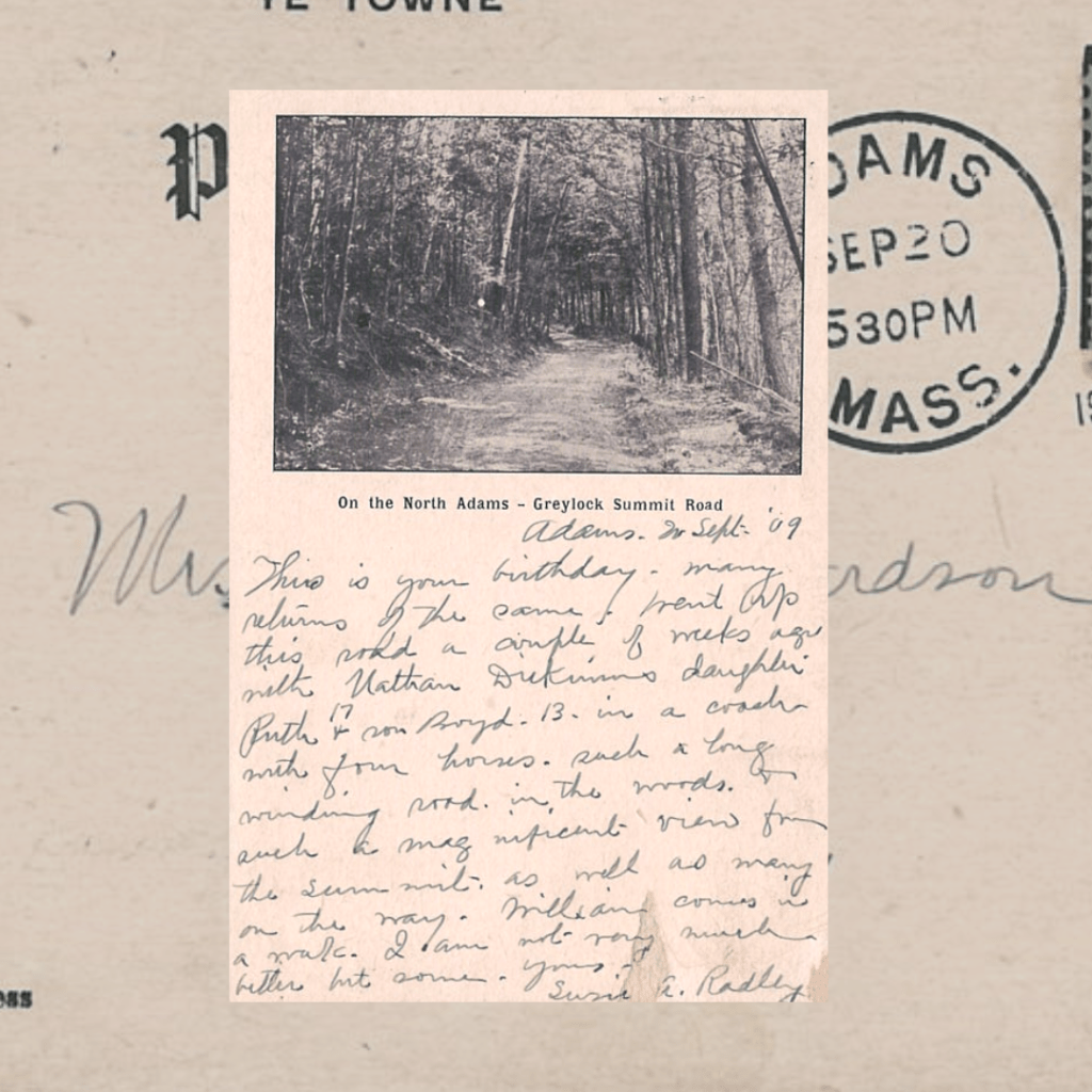 Although this card doesn’t give us too much, a simple “drive safe and in good condition,” implicitly it says a lot about the changing laws and norms that surrounded postcards. In 1907, it became legal to place a message on the back of postcards. This is known as the “divided back” period. Prior to 1907, postcards had to be addressed on the back, and any message was squished onto the front. This often caused problems, as the front of the postcard could smear, or there was very little room to write anything.