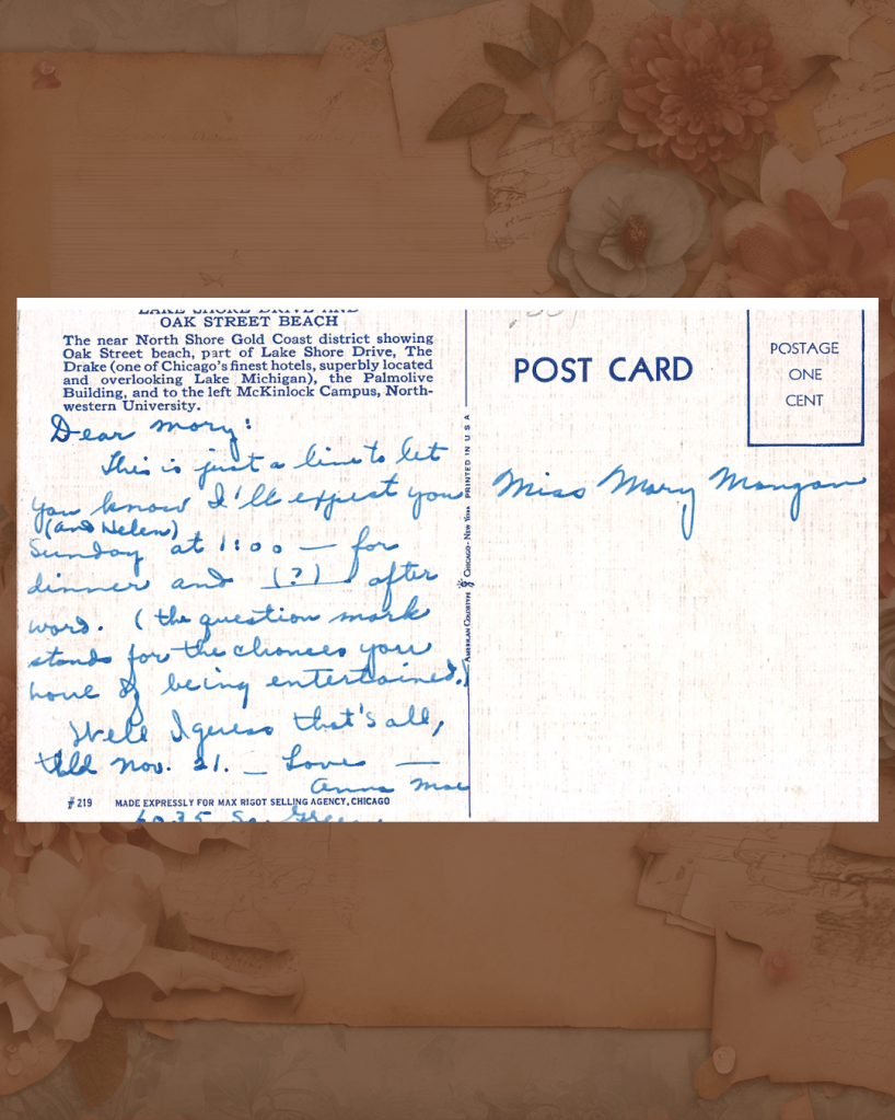 This is just a line to let you know I’ll expect you (and Helen) Sunday at 1:00 for dinner and (?) afterword. (the question mark stands for the choices you have for being entertained.)